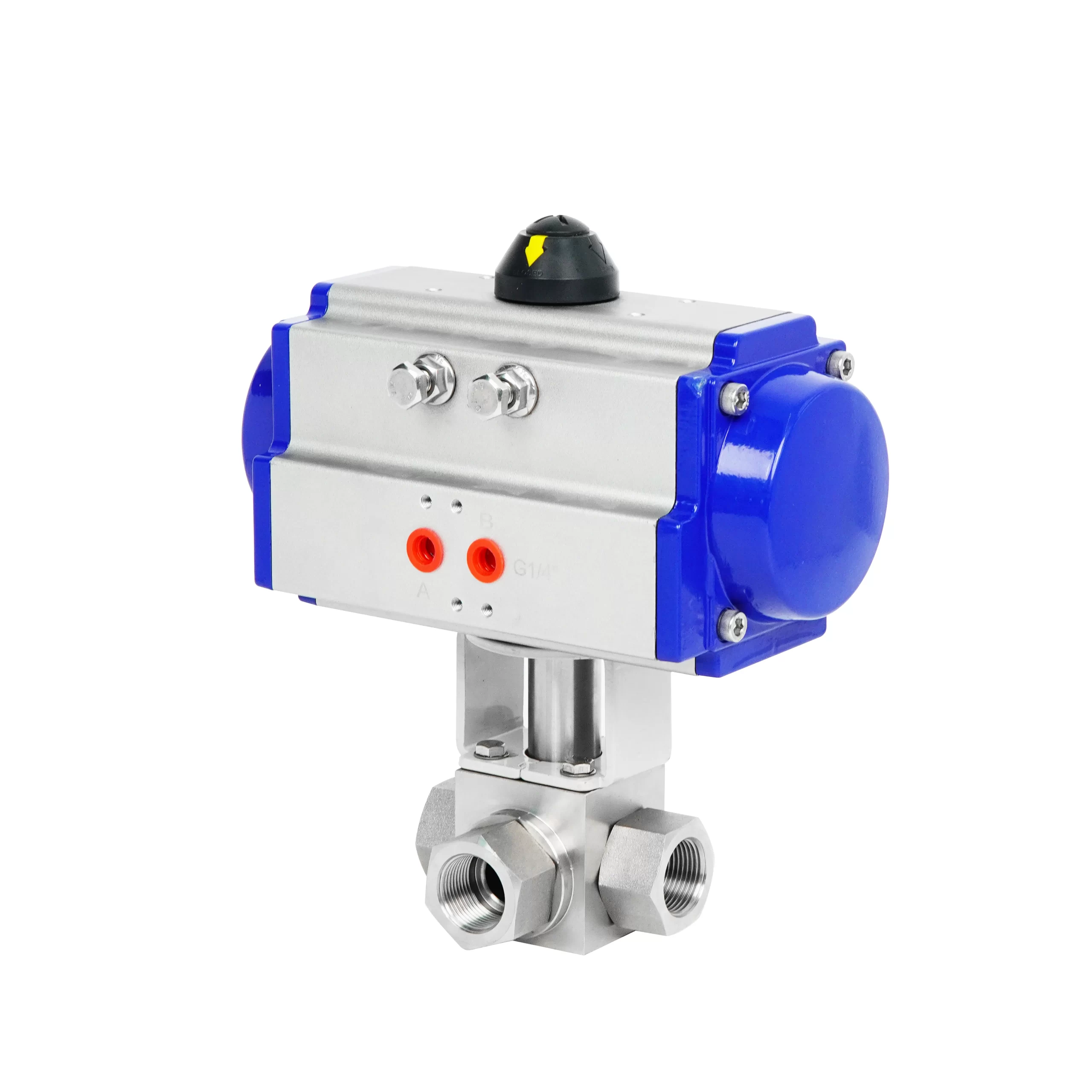 A robust pneumatic 3-way high-pressure ball valve with threaded ends, designed for fast, automated switching and reliable isolation of flow paths in extreme PSI applications.