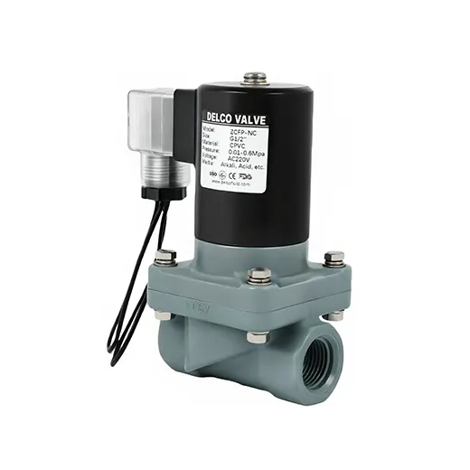 Серия DELCO ZCFP — это слегка коррозионно-устойчивый электромагнитный клапан с пластиковым корпусом из UPVC/CPVC, подходящий для мягких коррозийных жидкостей, включая соль, слабая кислота, и щелочные растворы (Например.., Серная кислота <10%). Доступно как в прямом актёрском режиме. (Нулевой старт) и типы с пилотным управлением, Он обеспечивает надёжный и экономичный контроль жидкостей для очистки воды и лёгкой химии.